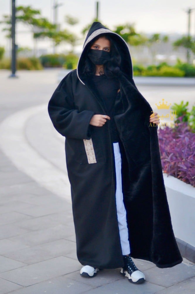 فروة شتوية جوخ مع فرو داخلي اسود ناعم ودافئ بتصميم مميز مع السدو التراثي تناسب الجنسين